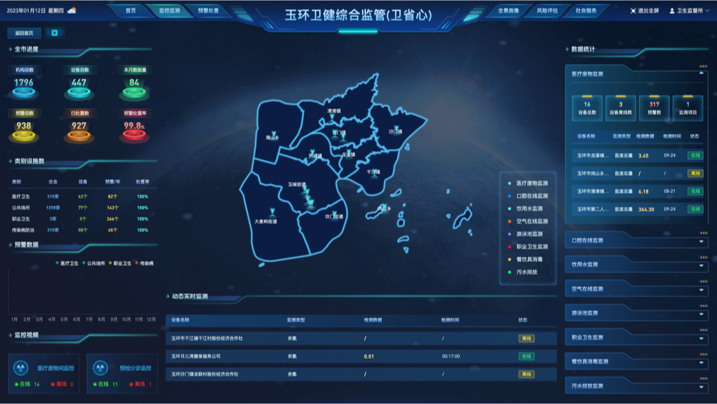在该场景中,医疗废物、口腔灭菌监测、泳池水质监测等各类别监测及预警信息可以“一屏掌控、一键推送”。