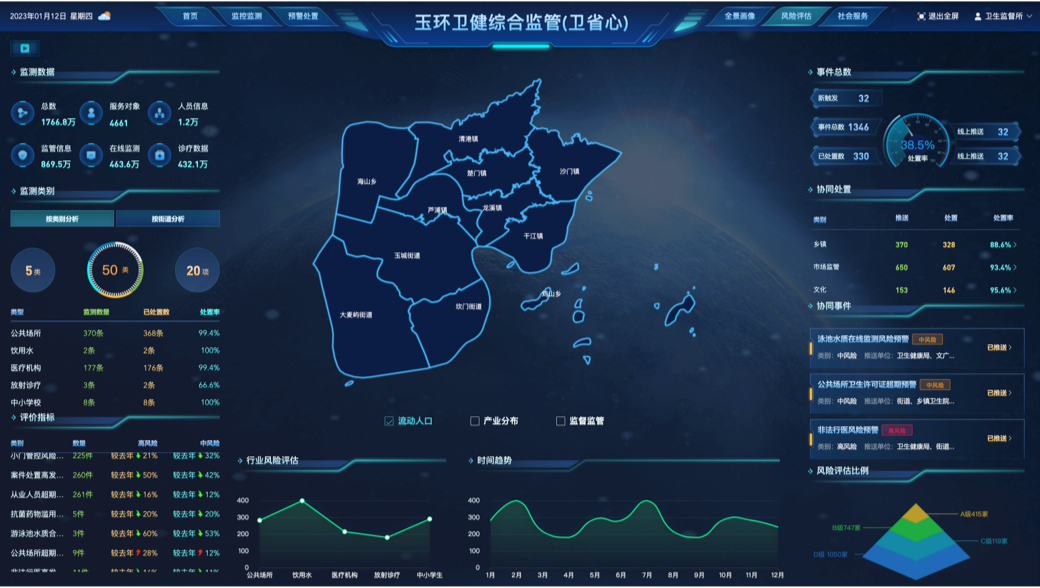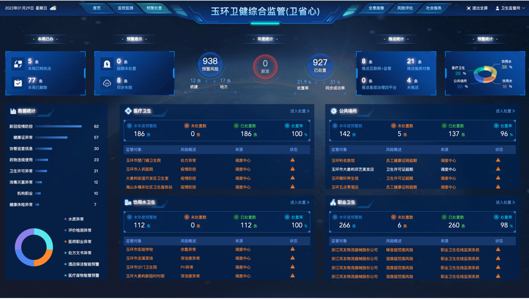 建立了“行业风险评估”模型,在饮用水、医疗安全、疫情防控等卫生健康重点领域管理形成区域性、行业性“风险三色管理”。系统自动触发高风险领域红黄警示,发送风险提示单至各相关部门,提高监管频次,开展协同监管。