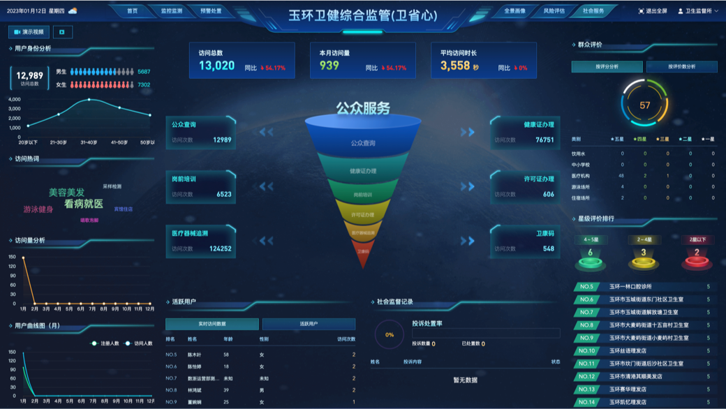 建立群众服务端,增强群众获得感,社会治理管服并举。面向群众提供服务对象卫生状态(包括实时监测数据、抽数据等)的公众查询,提供信息公开、社会评价、一键反馈服务内容。面向服务对象提供信息维护、自查自律、健康证件自我管理等内容,形成良好的社会共享共治局面,满足群众对卫生健康服务场所的多元需求。